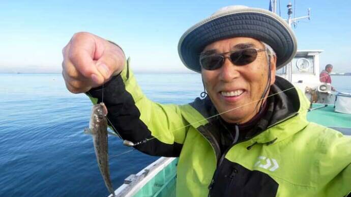 仕掛けを入れるとすぐに黒川さんの穂先にアタリが来た。巻き上げの重さが穂先に出る。上がってきたのは2歳魚の大型ワカサギ4連発である。いきなりの釣果に黒川さんもびっくり。