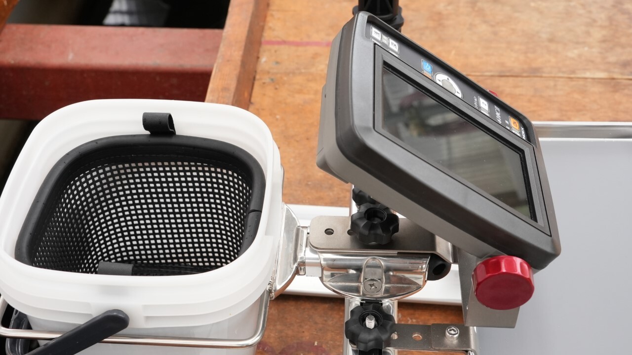 黒川さんが使用するBMOのワカサギシステムは、新しいクランプベースを使用したスペシャルバージョンである。通常のワカサギパックのアルミレールベースは全長800mmだが、新しく全長960mmのアルミレールベースのクランプベースが登場した。スペースにゆとりができるのが魅力だ。 そこにリール台2基、ワカサギレール用トレイをセット。魚探ボールマウントにホンデックスHE-90S、フィッシュセンサーアーム150mmタイプの下には振動子、上には船首方向が分かりやすいヘディングセンサー内臓GPSアンテナを取り付けてある。リール台の中心には、ワカサギライブウェルホルダーに一回り大きなコマセホルダーが付けてあり、角5Lの大型バケツがセットされている。