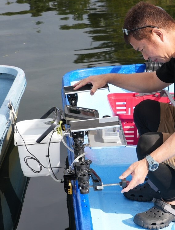 10月初旬、BMO社員の黒川直洋さんと浦野隆平さんが訪れたのは、湖の北側にあるレンタルボート店の牡丹屋。フラットで広いボートをレンタルした。エレキとバッテリーは持ち込んだものを使用し、アンカーとアンカーロープも2セット用意してきた。