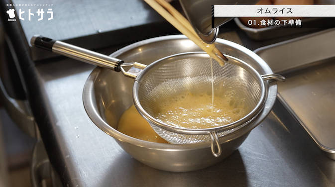 溶いた卵をざるで濾すことでオムレツの表面が均一にきれいに仕上がります。濾さなくてもいいですがカラザも取れるので、この工程を行うことをおすすめします。