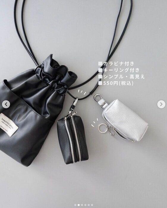 こちらのアイテムは、niko_kurashi_さんが3COINS(スリーコインズ)で発見したというもの。キーケースとして販売されているようですが、ミニサイズのポケットティッシュや、リップなども収納できるんだとか♪ 1点あたり550円とは思えない高見えデザインで、2色買いしたんだそうです◎