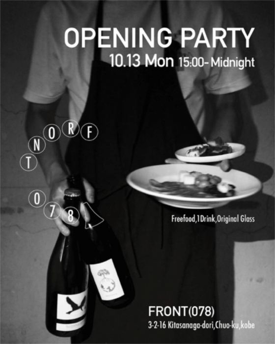 またオープンを記念して、10月13日に「FRONT(078) Opening Party」が開催されます。時間は15時から深夜までで、料金はオリジナルグラスとフリーフードにワンドリンク付きで1人3,000円(税込)。オリジナルグラスがなくなった際は、1人2,000円(税込)でワンドリンクとフリーフードが用意されます。