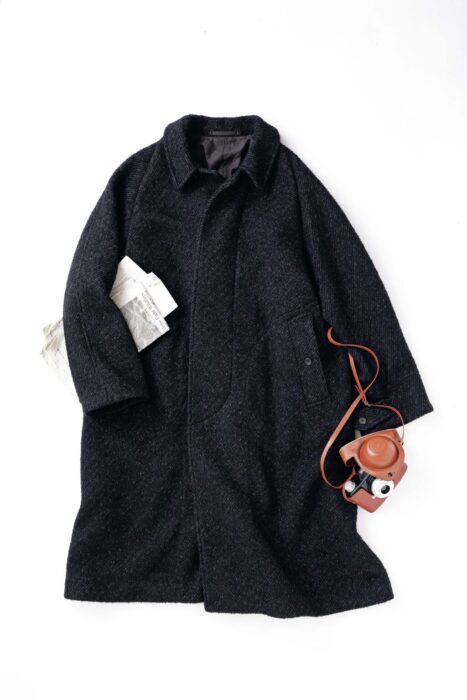 黒の持つ重厚さを纏うバルマカーンコート。丁寧なハンドクラフトによるディテールと、クラシック太番手のヘリンボーン生地が魅力。14万8500円(オールドジョー フラッグシップストアTEL03-5738-7292)