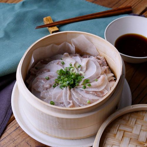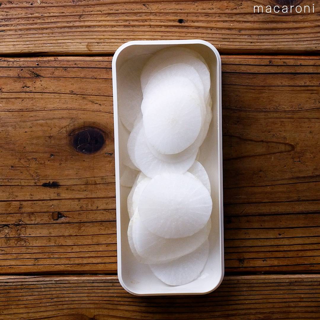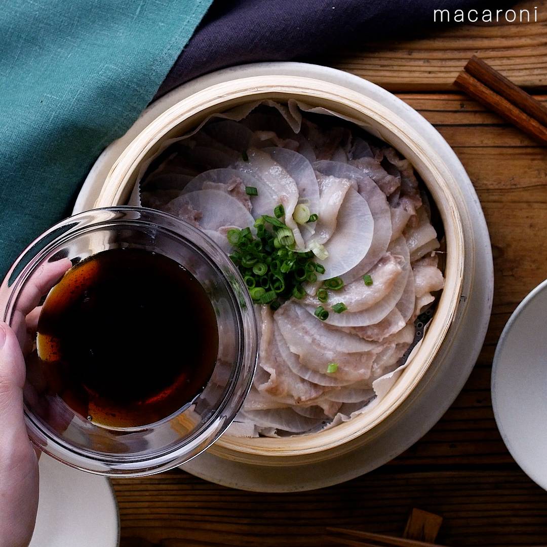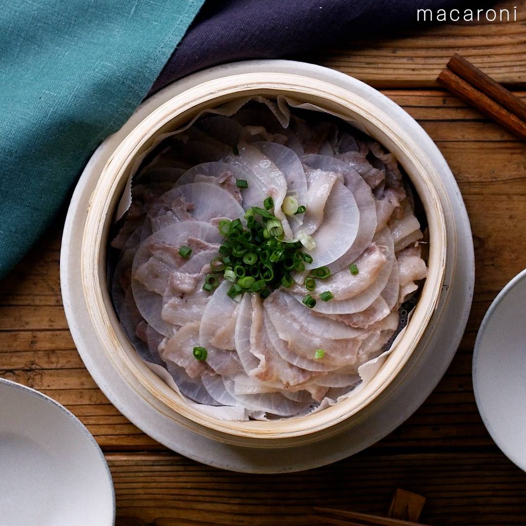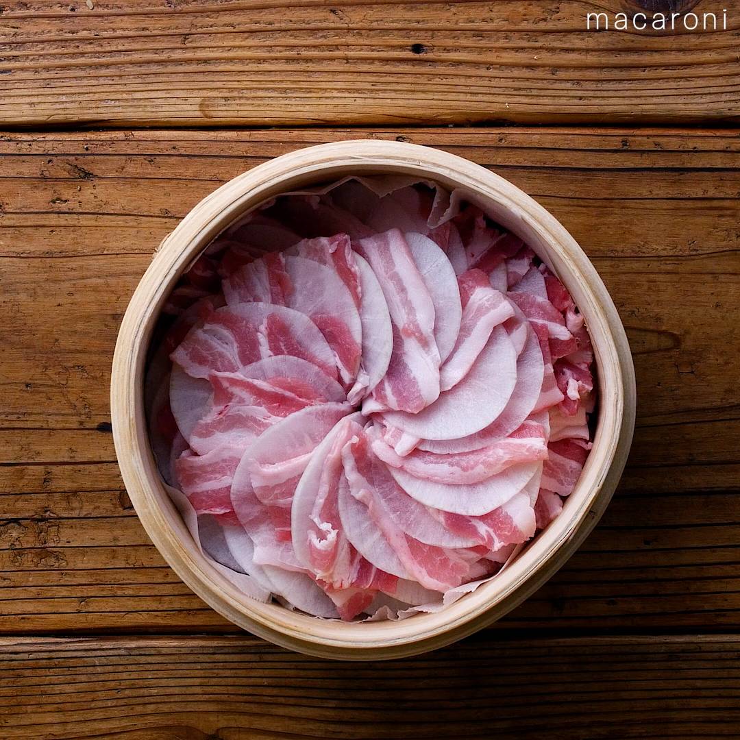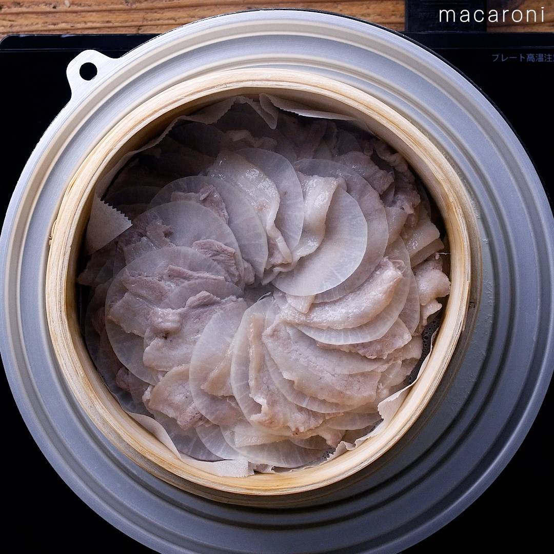 2: せいろに合わせて円を描くように、大根、豚肉の順に並べます。