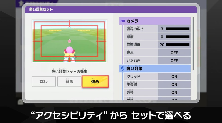 これは、3Dゲーム特有の画面酔いを軽減するもので、“アクセシビリティ”メニューから設定可能。画面内に黒い枠線やグリッドを表示するなど、視点の安定をサポートします。