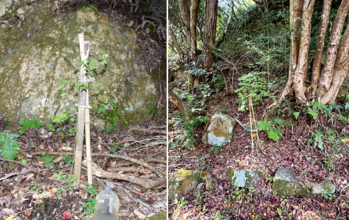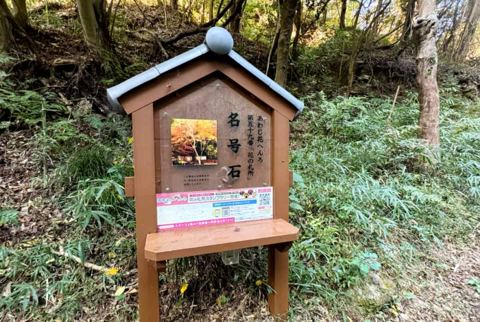 「約100m」地点にある小さな橋を渡ると、『名号石』はすぐそこ。周辺には大小様々なモミジの木が、山道を包むように枝を伸ばしています。ここは「あわじ花へんろ」第59番「花の札所」にも指定されています。