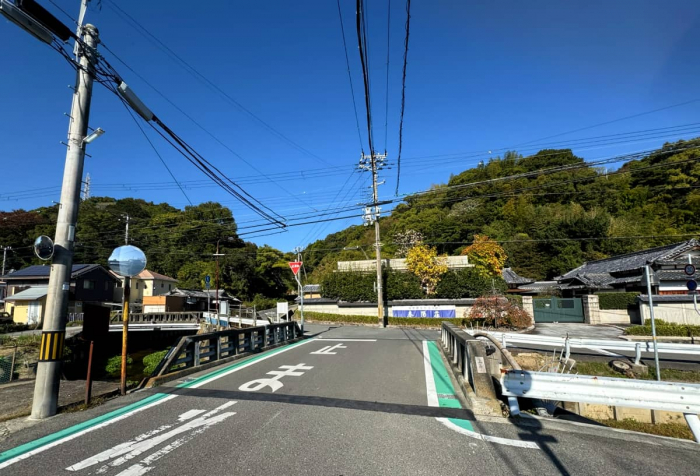 こちらが名号石へのスタート地点。写真右手には「国登録有形文化材 春陽荘」があります。この横にある川沿いの道を、真っすぐに登って行きます。