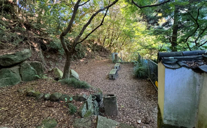 お堂の横には、地元の住民会等により整備された休憩場所があります。モミジの木々がつくる大きな木陰の中、石のベンチに座り、ペットボトルのお茶を飲みつつ渓流の音に耳を傾けると、何とも穏やかな気分になりました。