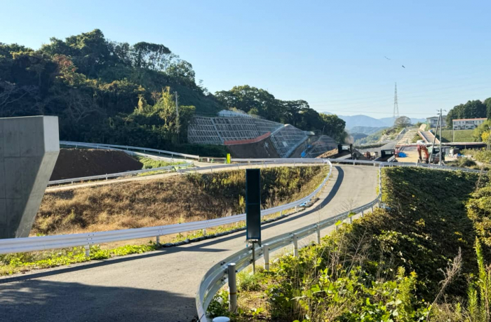 斜め後ろを振り返ると、やはり建設中のバイパス道路の風景。子どもの頃からこの場所を知る記者は変わりゆく景色に戸惑いを覚えますが、道路が完成すれば国道28号線の渋滞が大幅に緩和されて、多くの人が恩恵を受けることでしょう。