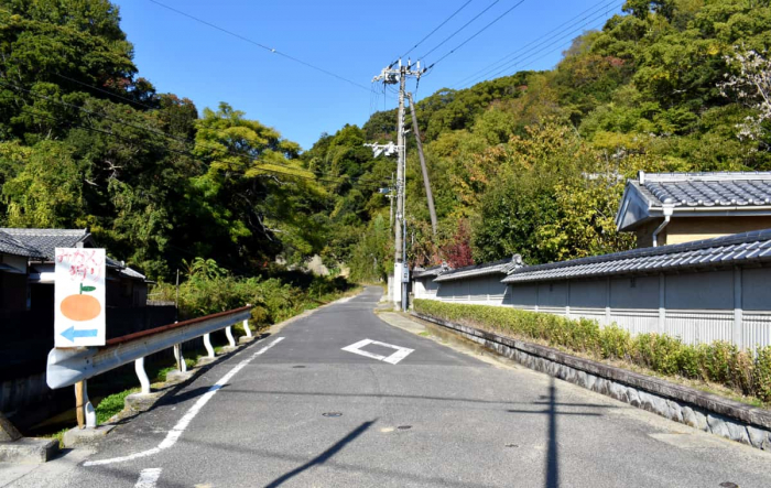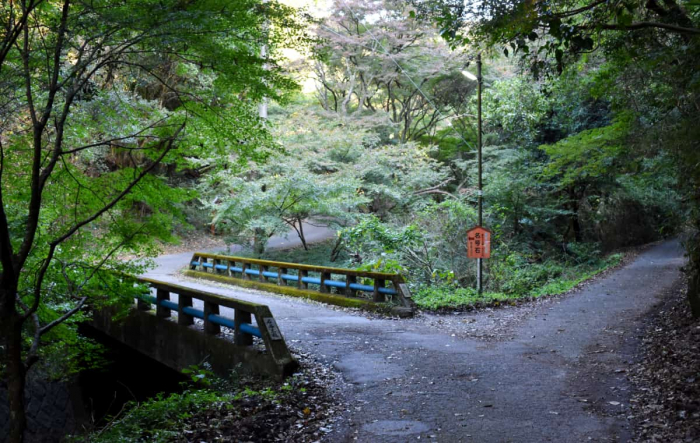 この道路は基本的に細い山道で自動車同士の対向が難しいため、徒歩で向かうのがおススメです。舗装された緩やかな坂道が続くので、緑濃い景色の中、気持良い山歩きが楽しめます。この道は、地域の住民や職場で働く人の散歩コースとしても親しまれています。