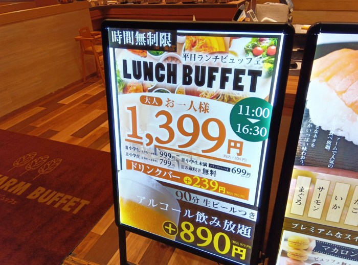 そのレストランの名前は『グランファームビュッフェ イオンモール旭川駅前店』。同じ北海道でも札幌だと都会価格だし、小樽だと観光価格で高くつきがちなので、イオンモールとはいえ、意外と旭川ならではの店と言えるかもしれない。