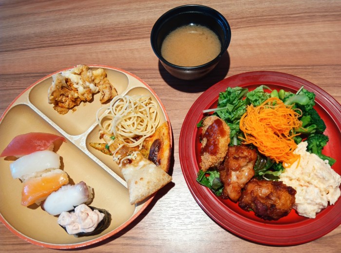 食べ放題メニューにはザンギ、北海道産牛肉コロッケ、とんかつなどの和食はもちろん、ピザ、パスタ、グラタン、フライドポテトなどの洋食、麻婆豆腐や肉団子のチリソースなどの中華、おまけにケーキなどのスイーツまで揃っていた。