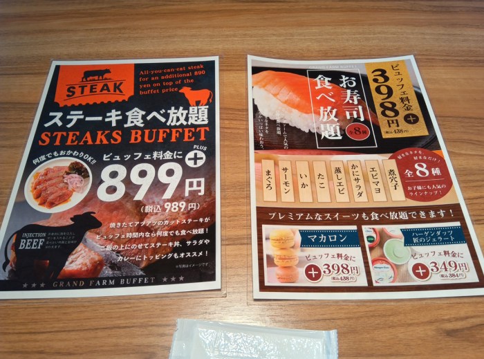 ちなみにこのレストラン、プラス税込989円でステーキも食べ放題になる。おいおい、松屋のブラウンソースエッグハンバーグより安いじゃないか。1回じゃとても味わい尽くせそうにない『グランファームビュッフェ』。誠にフラッと訪れたい店である。