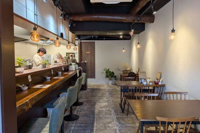 扉を開けると満月のような形のあかりが店内を柔らかく照らす、ほっと落ち着く空間が広がっています。