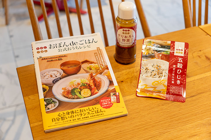 「すりおろし野菜ドレッシング」や「五穀ひじき混ぜごはんの素」といった便利なアイテムに加え、書籍『おぼんdeごはん公式おうちレシピ』も登場。