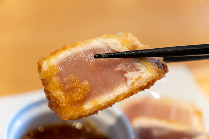 「びんちょうまぐろのレアカツ おろしぽん酢」は、お刺身用の新鮮なびんちょうまぐろを店舗で一つ一つ丁寧にパン粉付けし、中がレアな状態でサクッと揚げています。