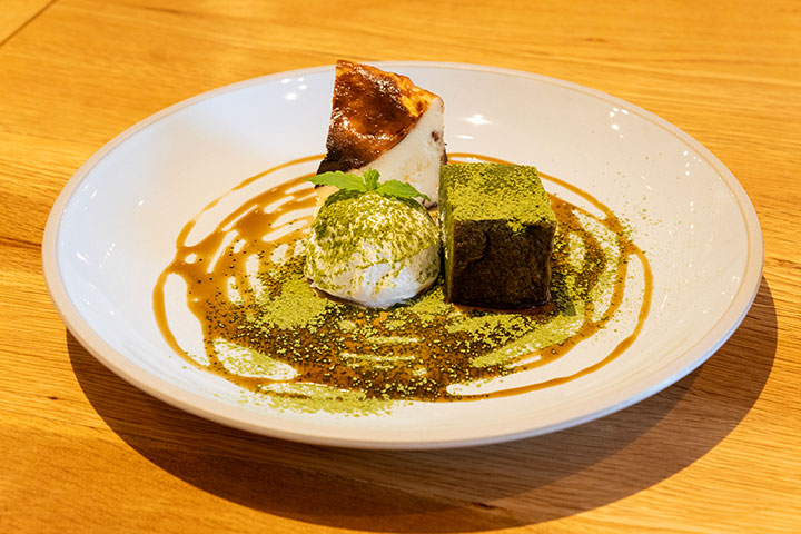 特におすすめは、しっとり濃厚なバスクチーズケーキと、上品な甘さの抹茶チョコレートテリーヌを一度に味わえる「ハーフ2種盛り」です。