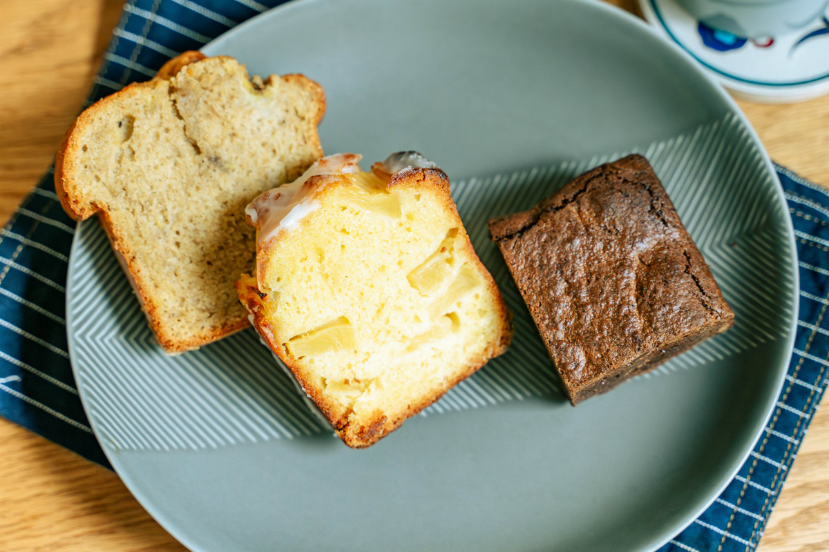 テイクアウト可能な焼き菓子には、「バナナブレッド」や「ブラウニー」などがラインアップ。焦がしバター入りの「バナナブレッド」は、ふわふわしっとり食感で甘さ控えめ。バナナがやさしく香る、毎日でも食べたいおいしさです。