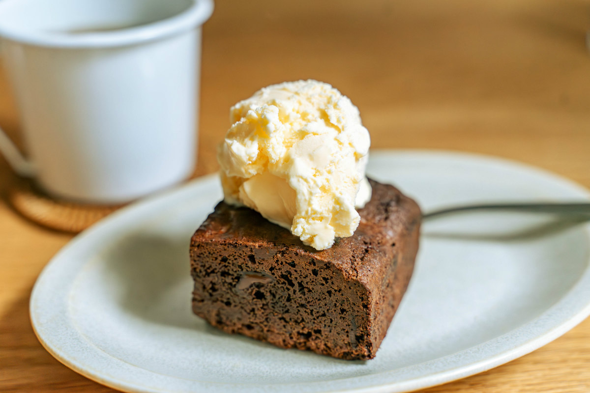 外側サクサク、中はねっちりのアメリカンスタイルの「ブラウニー」は、少しだけリベイクして、アイスクリームをトッピングするのがおすすめの食べ方。生地にじゅわっと染み込んだアイスクリームがクセになりそうです♪