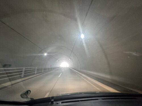 こちらのトンネルは、入口に注意の看板も出ていましたが、とても霧っぽいです。前が見えないというレベルではありませんが、視界が白っぽいなという感じです。