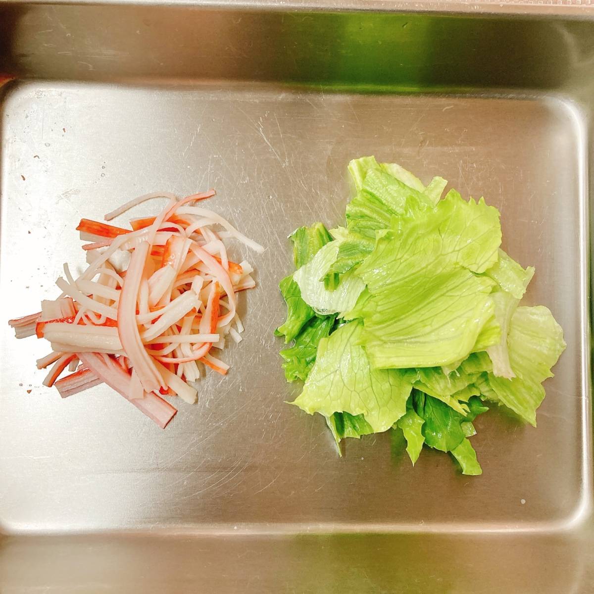 カニカマの赤とレタスの緑がきれいなチャーハンが完成しました。