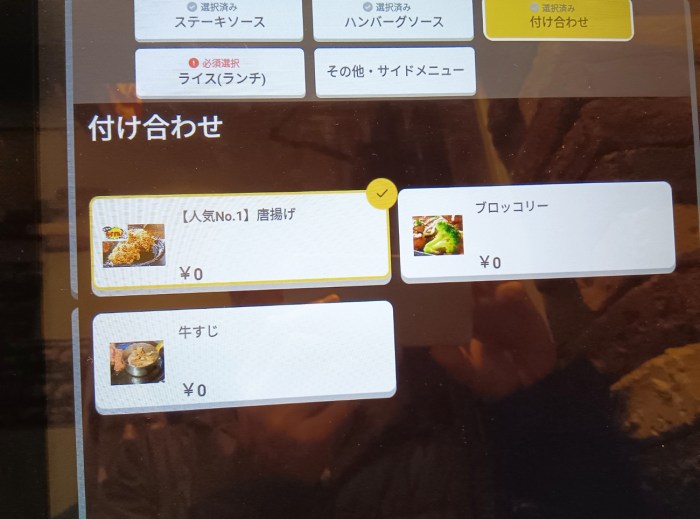 無料の付け合わせで唐揚げ2個が選択できるのが熱い。唐揚げをサイドと分類するところにがっつり系の気概が感じられる。