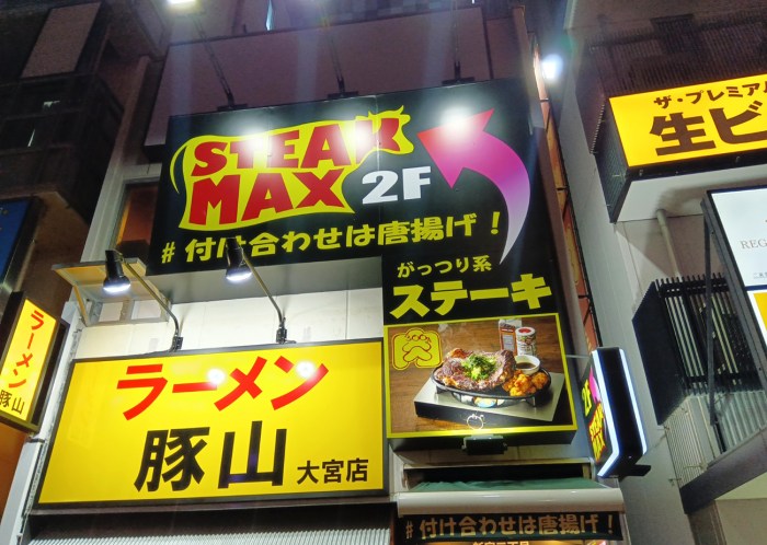 放送終了後に、せっかくなので大宮で食べて帰ろうと駅前をブラブラしていたところぴったりの店を見つけた。その名も『ステーキMAX』。東口出てすぐ、ガッツリ系のオーラをストリートにまき散らしているステーキハウスである。