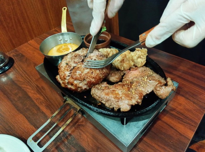 「コンボA(がっつりステーキ+ハンバーグ)」のハンバーグ300g、ステーキ150gを注文したところ、目の前で店員さんがハンバーグを切ってくれて、静岡の『さわやか』みたいだった。それにしても、ハンバーグとステーキだけじゃなく……