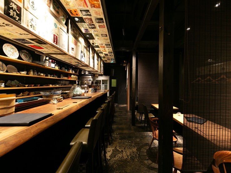 趣のある扉の向こうに広がる店内は、シックな黒をベースにしたくつろぎの空間。一人飲みでもデートでも使えるカウンター席のほか、テーブル席や個室も完備しています。日本酒はプレミアムな銘柄も含め、常時100種類以上がスタインバイ。深夜まで営業しているので、2軒目以降に立ち寄ってみるのもオススメです。