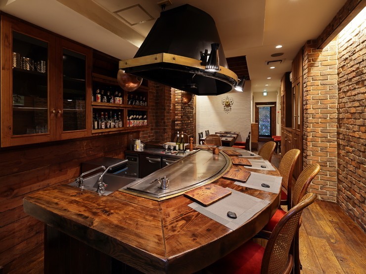 アンティークの古材や煉瓦を活用した高級感のある内装が特徴の店内。テーブル席もありますが、調理の様子が間近で眺められるカウンター席を目当てに訪れるゲストが多いのだそう。アットホームな雰囲気は、一人のみでもデートや会食でも幅広く対応可能。スタッフは皆英語が堪能なので、海外からのゲストを招いての食事会や接待の場でも重宝する一軒です。
