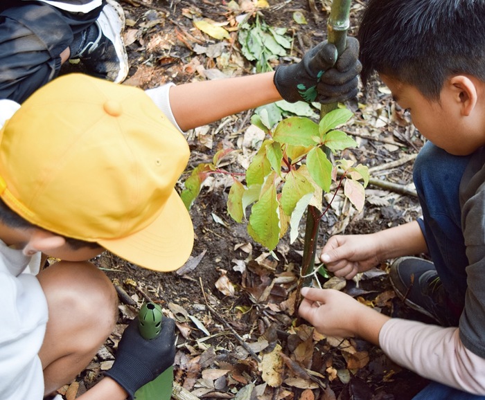 児童らは当日、乱立する竹の切り出しを行った後、苗木の植樹を体験。南雲さんは「植樹すると、自分が植えた木がどのくらい育ったか気になるもの。地元の子どもたちが、自分たちが暮らす町の身近な自然に目を向けるきっかけになればうれしい」と話していた。