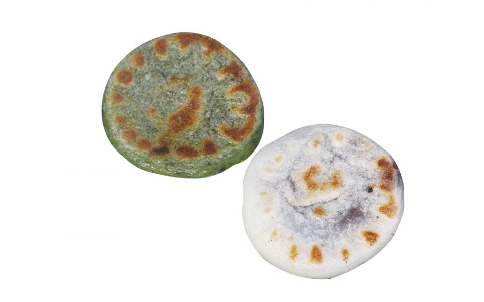 第五十一番札所の石手寺の境内で食べられる名物やきもち。米粉やこしあんを使用した薄型の焼き餅で、観光客はもちろん、地元客にも愛される。1枚100円で2枚からの販売。甘酒や抹茶のセットもあり。
