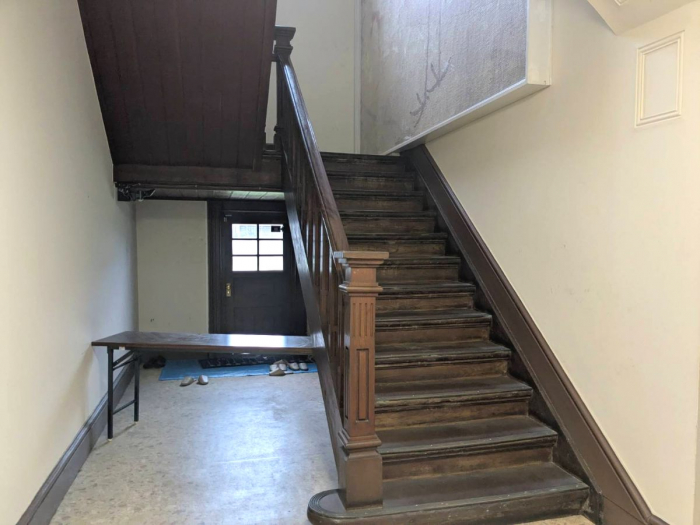 こちらが2階へ上がる階段。親柱の形状や円弧を描く1段目は、今ではあまりみないデザインでおしゃれです。