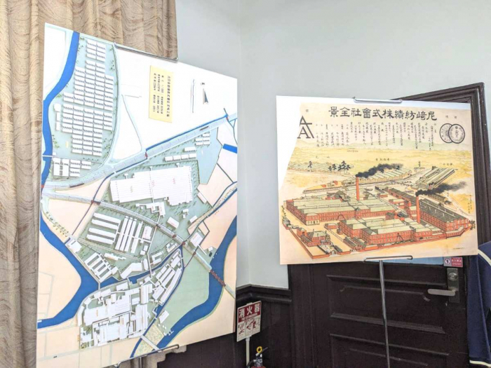 当時の資料などを用いて説明を聞くと、工場の周りには社宅や寄宿舎のほか病院や小学校まであり、一つのコミュニティが形成されていたそう。1918年には『大日本紡績』となり、日本最大の紡績企業にまで発展したそうです。