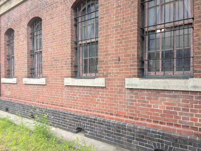 同建物は「イギリス積」によるレンガ造で、入口部分には赤レンガだけでなく、赤レンガを高温で焼き強度を増して作られた「黒レンガ」も使用されています。基礎部分に使われているのはもちろん、外観上のデザインにも活用されているのが素敵でした。