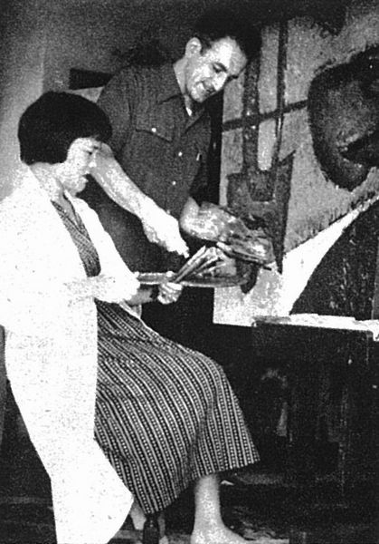 ▲《いのち》制作中の江見絹子と夫のアンリ・ガイヤール。荻野は父親の半生をモデルにした長編小説『ホラ吹きアンリの冒険』で2002年読売文学賞を受賞した。