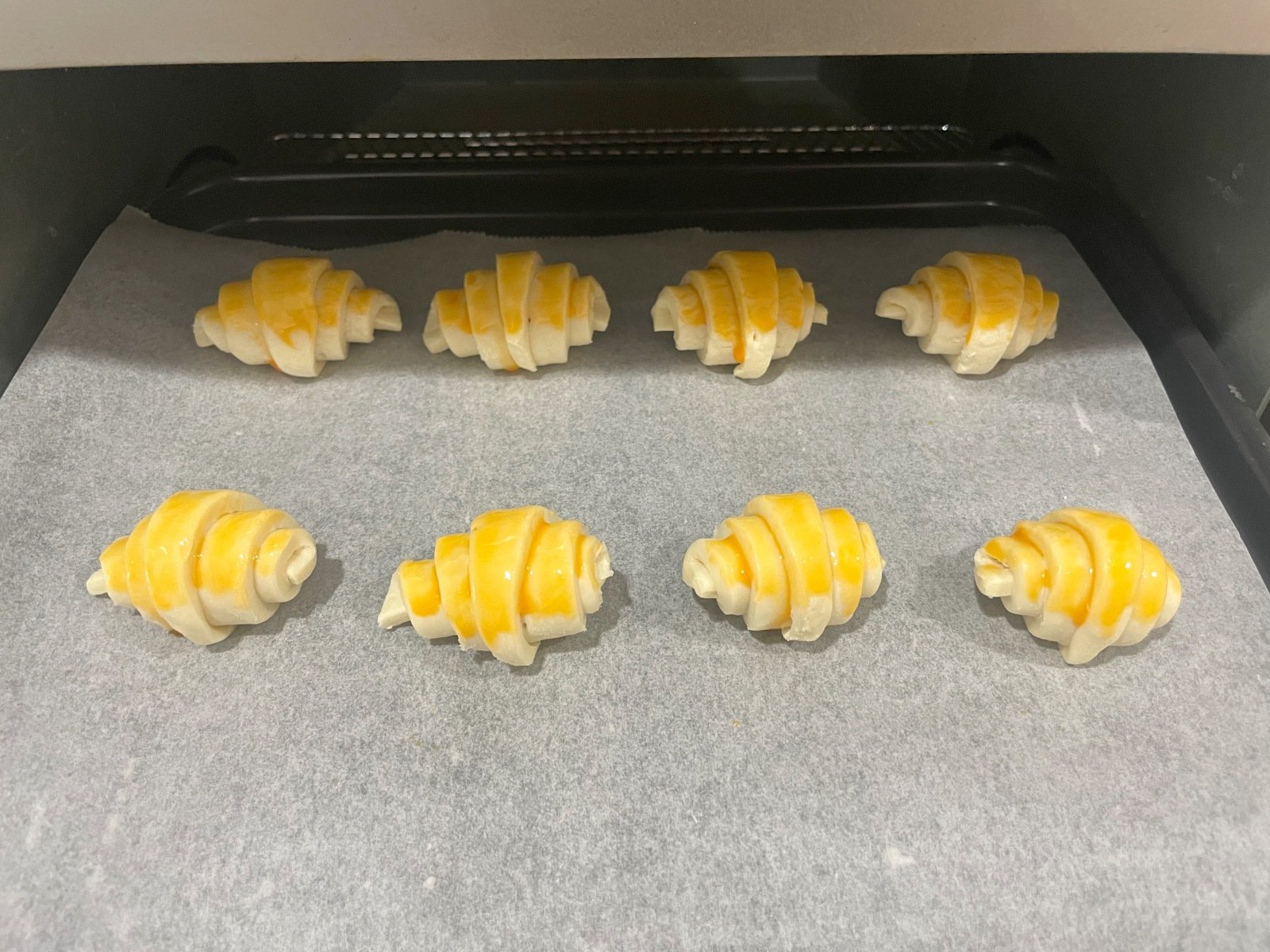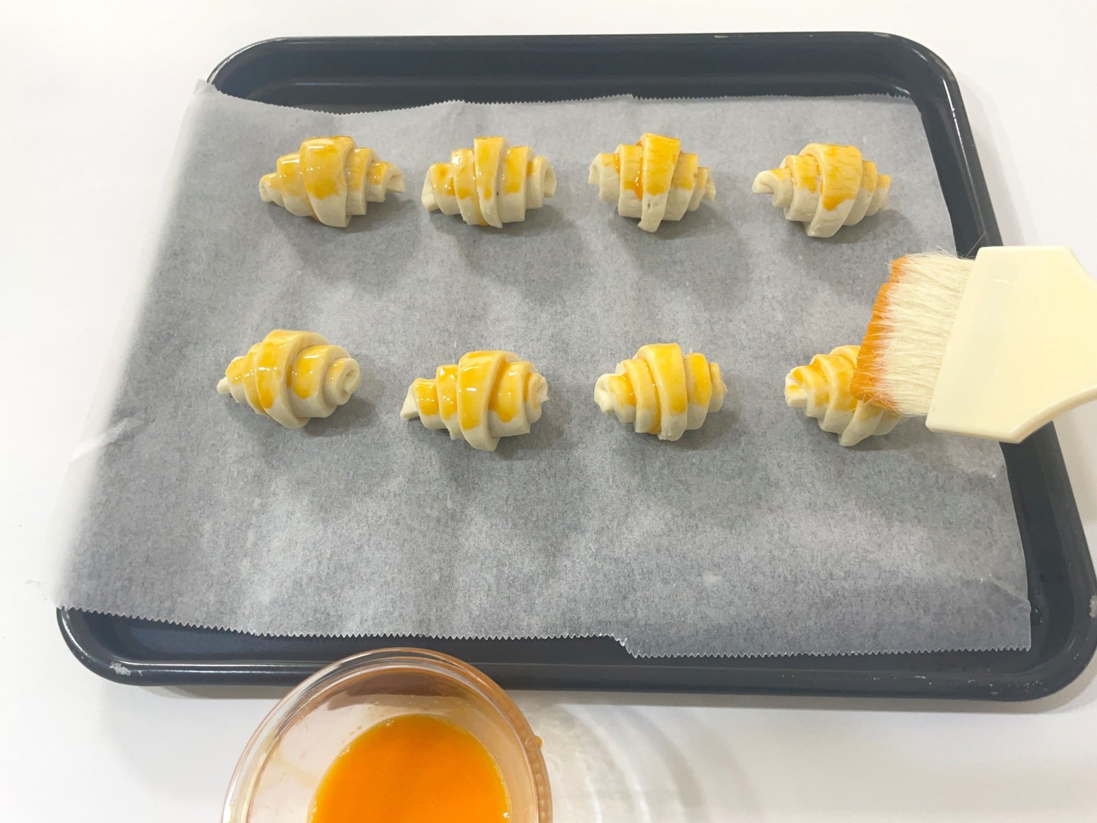 5.クッキングシートを敷いた天板に、巻き終わりを下にして置き、表面に卵黄を塗ります。