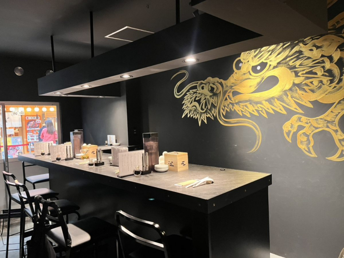 一歩足を踏み入れると、黒を基調としたクールでスタイリッシュな空間が広がり、壁には大迫力の金の龍が描かれています。
