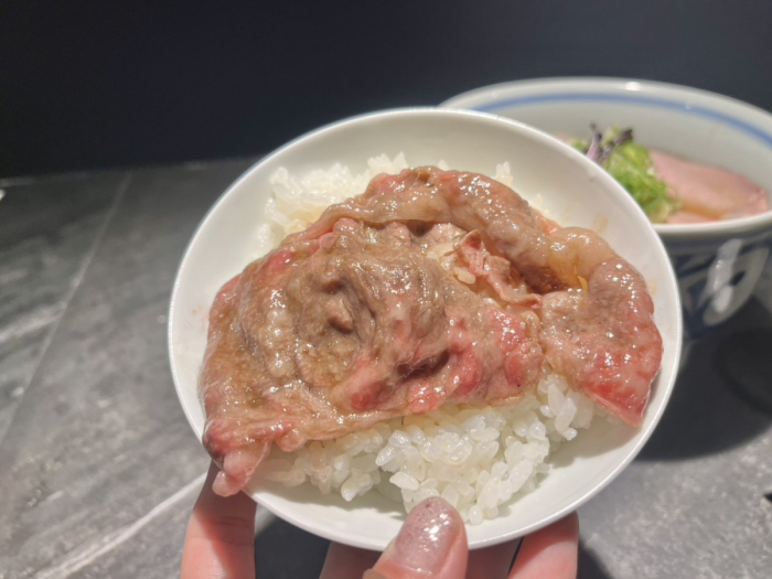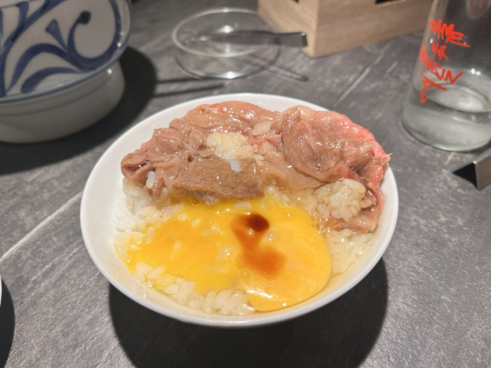 続いてサイドメニューの「黒毛和牛焼きすきご飯 」。まずはそのまま一口。とろける柔らかさの肉の甘みとタレの旨みが口いっぱいに広がり、思わず笑顔になる美味しさです。