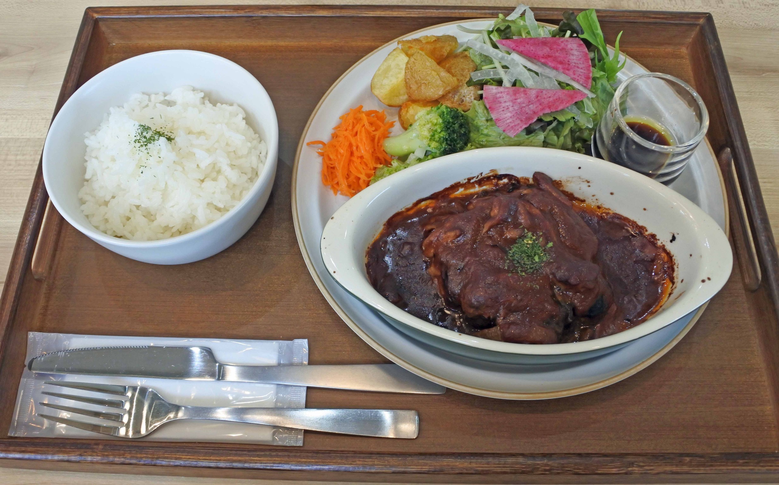 筆者が取材に訪れた日は、蜂蜜を使ったデミグラスソースの煮込みハンバーグが主役のランチ『煮込みハンバーグ(ライス付き)』(1,200円)をいただきました。