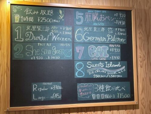 レギュラーサイズとラージサイズのグラスで、一杯ずつ楽しむこともできますが、いろいろ飲みたい方にはやっぱり、3種飲み比べ(1,500円)がおすすめ! 1時間飲み放題2,500円の飲み放題システムもあるので、レギュラーサイズで3杯以上飲める方は、飲み放題もお得ですよ。