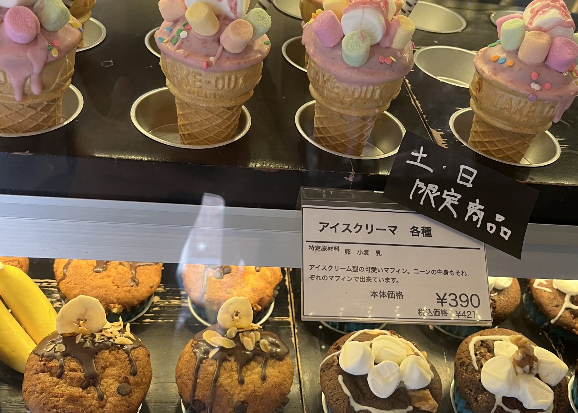 鵠沼海岸駅から徒歩1分の「マフィンラボ」は、カラフルで可愛いデザインのマフィンが揃う人気店。ショーケースには季節の味や個性的なトッピングが並びます。