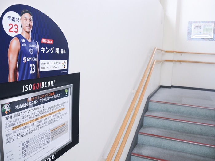 磯子区総合庁舎内の階段に11月12日から、プロバスケットボールクラブの横浜ビー・コルセアーズ(横浜BC)所属選手のパネルなどが新たに登場した。
