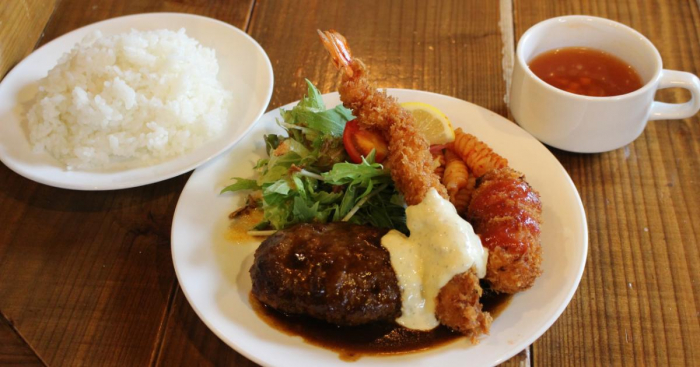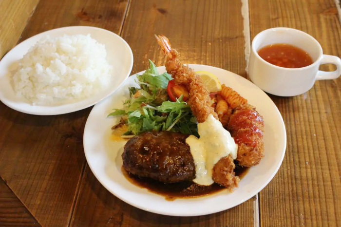 100年ハンバーグに、エビフライ、エビクリームコロッケ、ライスまたはパン、そして季節のスープが付く、洋食の魅力を余すことなく味わえる贅沢なセットで、プレートの上には、主役だけでなく、アーリーレッドのマリネやポテトサラダなども添えられ、五色を意識した華やかな盛り付けになっています。