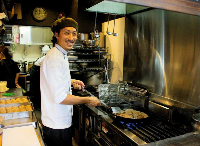 厨房では、オーナーシェフがハンバーグを一つひとつ丁寧に焼き上げていきます。特大フライパンに10個ほど並べ、表面に焼き色をつけてから、さらにオーブンで8分ほどじっくりと火を通すのだそう。無駄のない動きと集中したまなざしに、100年以上続く味を“守る”という覚悟がにじんでいました。