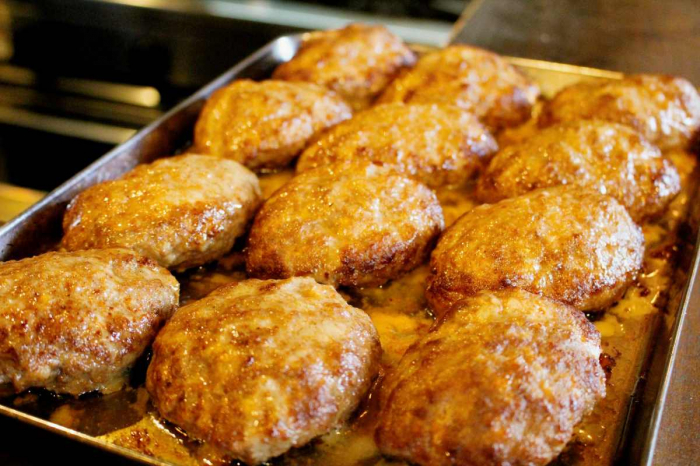 仕込みの段階でずらりと並ぶハンバーグ。一つひとつ手作業で仕込まれ、丁寧に焼き上げられていきます。