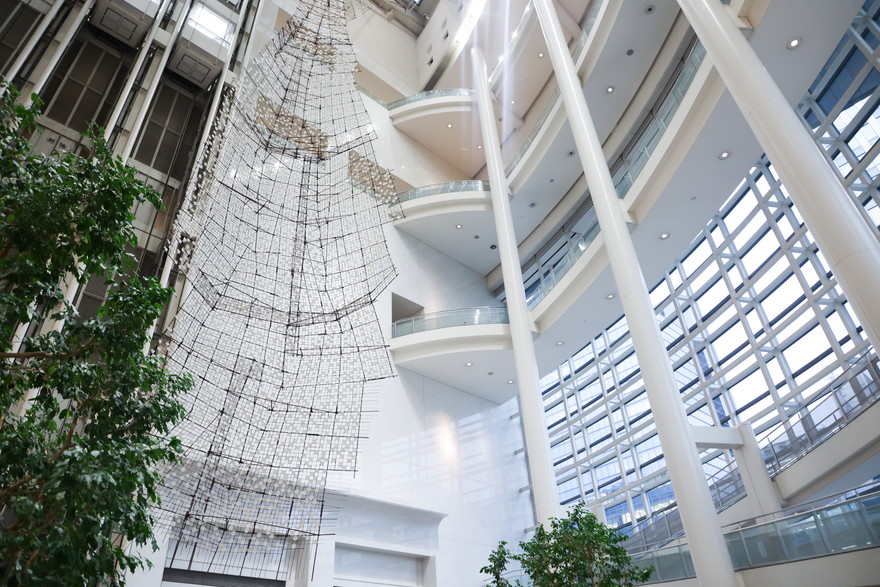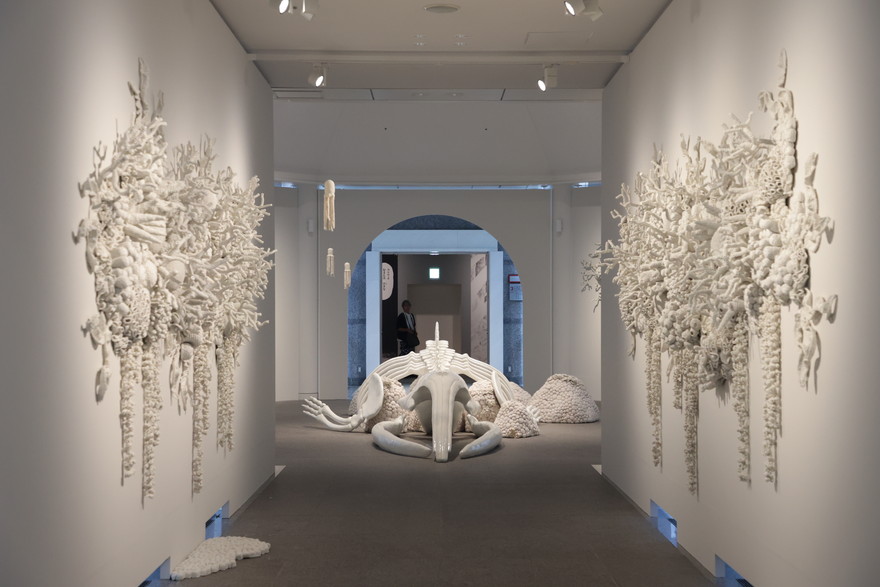 10階の入り口すぐに、大規模なインスタレーションを制作したのが、インドネシアのアーティスト・ムルヤナさんです。工場の余剰分やリサイクルされた糸を使用し、かぎ針編みの手法で作られています。ムルヤナさんが思い描く理想の美しい海を色鮮やかな毛糸で、その向こう側にある白化した珊瑚や鯨の骨を真っ白な毛糸で表現。生と死をイメージした対照的な展示で、一気に惹きつけられました!