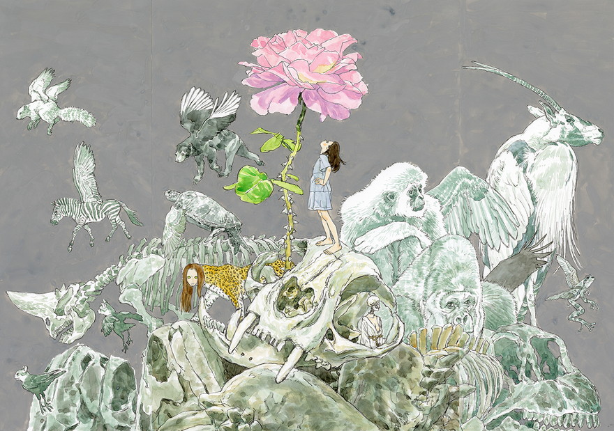 愛知県のまちのあちこちで見かけるこの印象的なイラスト。これは、漫画家・五十嵐大介さんが、芸術祭のテーマ「灰と薔薇のあいまに」をもとに描いた「あいち2025」のキービジュアルです。愛知芸術文化センター8階「ラーニングセンターへたち」では、10月19日まで原画を展示中です。