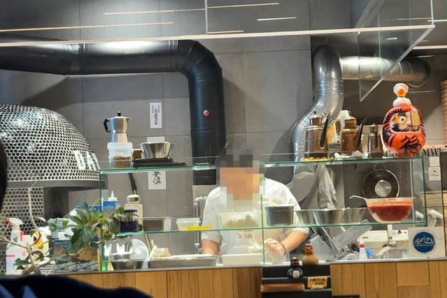 そろそろか?と調理場を見ると、薪窯焼きの自慢のナポリピッツァを調理されてる様子。高温、短時間で仕上げる薪窯焼きピッツァ。