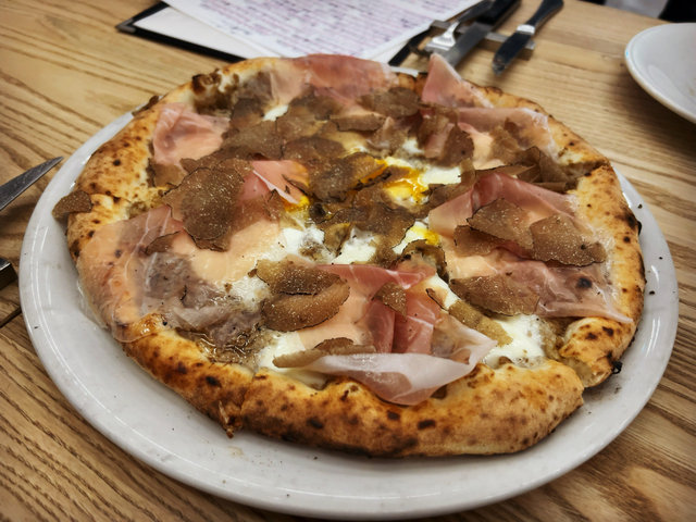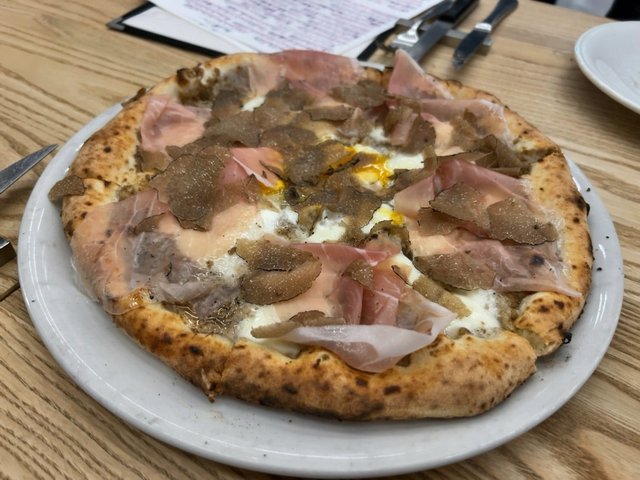 秋トリュフ、トリュフペースト、水牛モッツァレラ、生ハム、卵、黒胡椒のリッチなトッピング。トリュフの風味濃厚、水牛モッツァレラのコク、生ハムのいい塩味と卵黄のマイルドさ。味の複雑さを演出する構成要素の多い、味わい深い一枚でした。